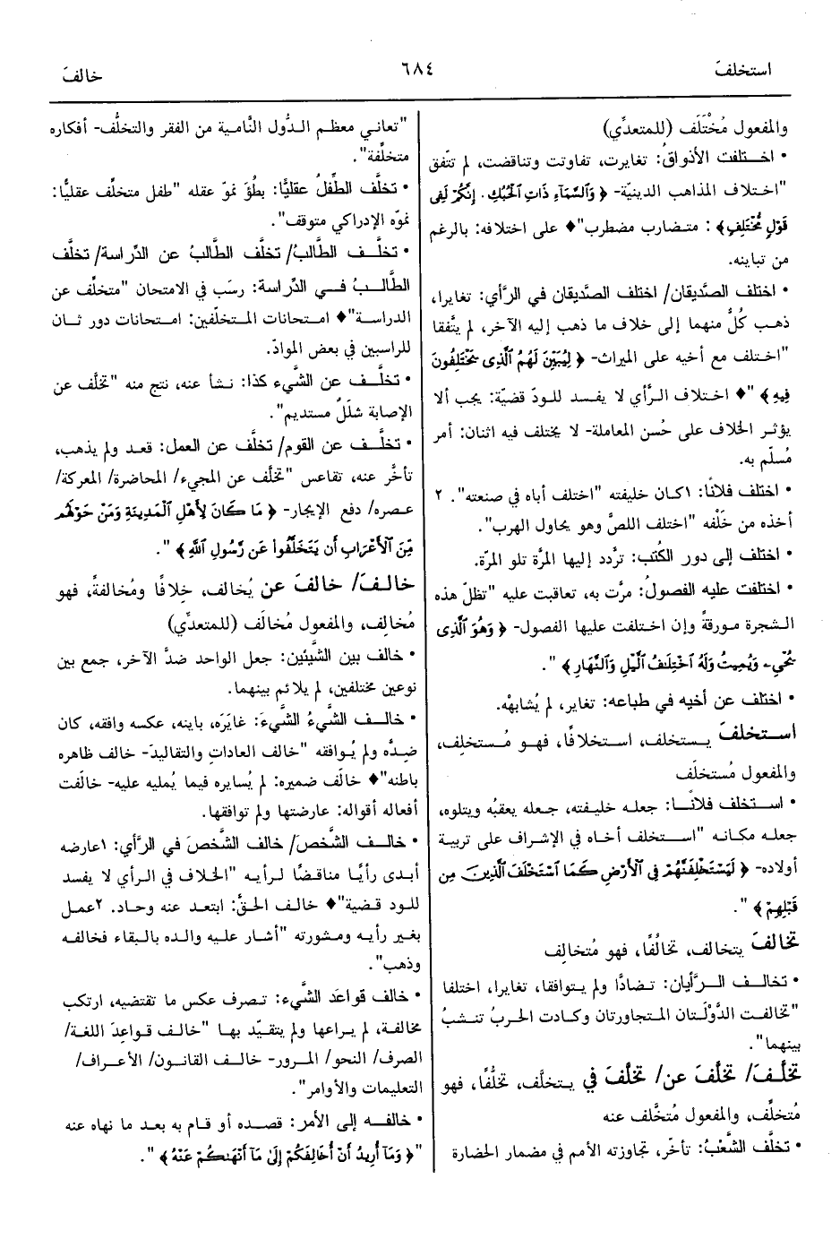 -[685]- • خالف عن أمره: خرج وعارض " {فَلْيَحْذَرِ الَّذِينَ يُخَالِفُونَ عَنْ أَمْرِهِ أَنْ تُصِيبَهُمْ فِتْنَةٌ} ".