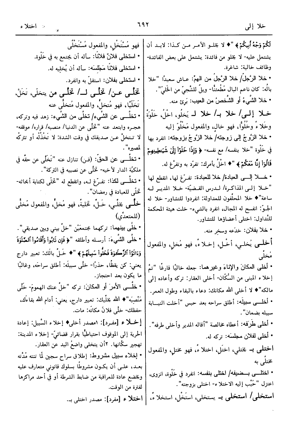 • خلا إلى العبادة/ خلا للعبادة: تفرّغ لها، انقطع لها "خلا إلى المذاكرة/ لدرس القضيّة- خلا المدير له ساعة"? خلا المحلِّفون للمداولة: انفردوا للتشاور- خلا له الجوّ: انفسح له المجال، انفرد بالشيء- خلت هيئة المحكمة للتَّداول: اختلى أعضاؤها للتشاور.
