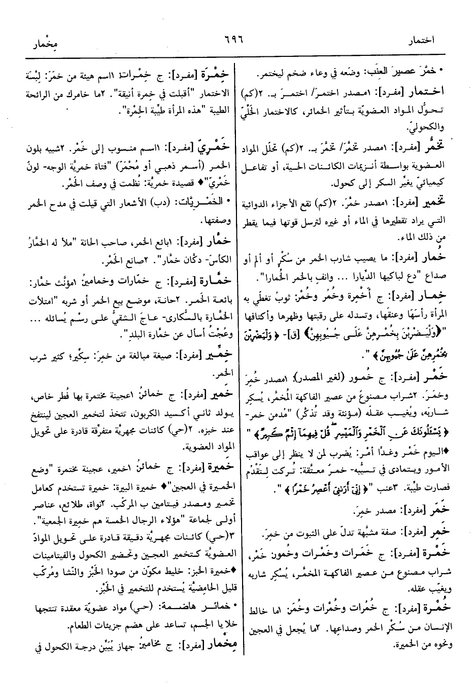 2 - شراب مصنوعٌ من عصير الفاكهة المُخمَّر، يُسكِر شاربَه، ويُغيب عقلَه (مؤنثة وقد تُذكَّر) "مُدمن خمر- {يَسْأَلُونَكَ عَنِ الْخَمْرِ وَالْمَيْسِرِ قُلْ فِيهِمَا إِثْمٌ كَبِيرٌ} " ° اليوم خَمْر وغدًا أمْر: يُضرب لمن لا ينظر إلى عواقب الأمور ويتمادى في تسيُّبه- خمرٌ معتَّقة: تُركت لِتَقْدُم فصارت طيِّبة.