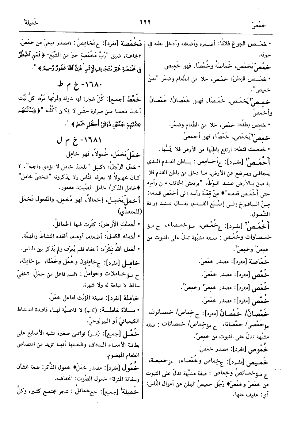 • خمُص البطنُ: خمَص، خلا من الطَّعام وضمُر "بطنٌ خميص".