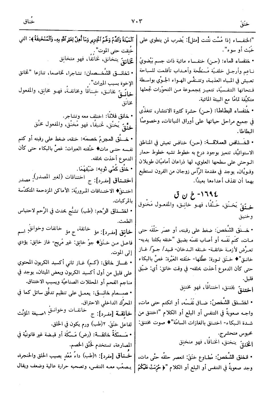 خانِق [مفرد]: مؤ خانقة، ج مؤ خانقات وخوانقُ: اسم فاعل من خنَقَ ° جوّ خانِق: غير مُرِيح- غاز خانِق: يؤدي إلى الموت.