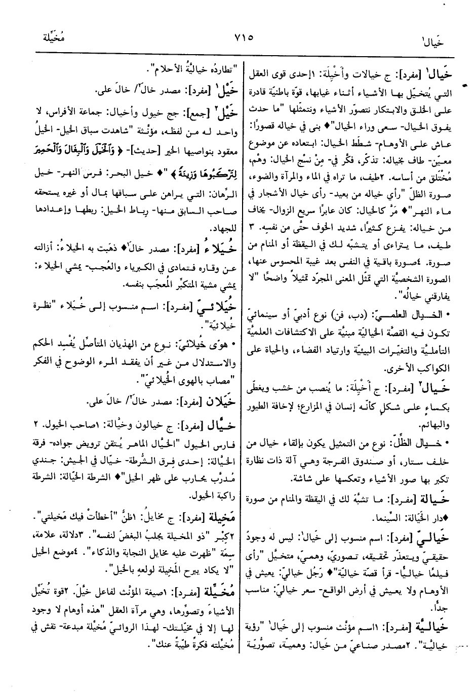 1 - إحدى قوى العقل التي يُتخيّل بها الأشياء أثناء غيابها، قوّة باطنيّة قادرة على الخلق والابتكار نتصوّر الأشياء ونتمثّلها "ما حدث يفوق الخيال- سعى وراء الخيال" ° بنى في خياله قصورًا: عاش على الأوهام- شطَط الخيال: ابتعاده عن موضوع معيّن- طاف بخياله: تذكّر، فكَّر في- مِنْ نسْج الخيال: وهْم، مُخْتَلق من أساسه.