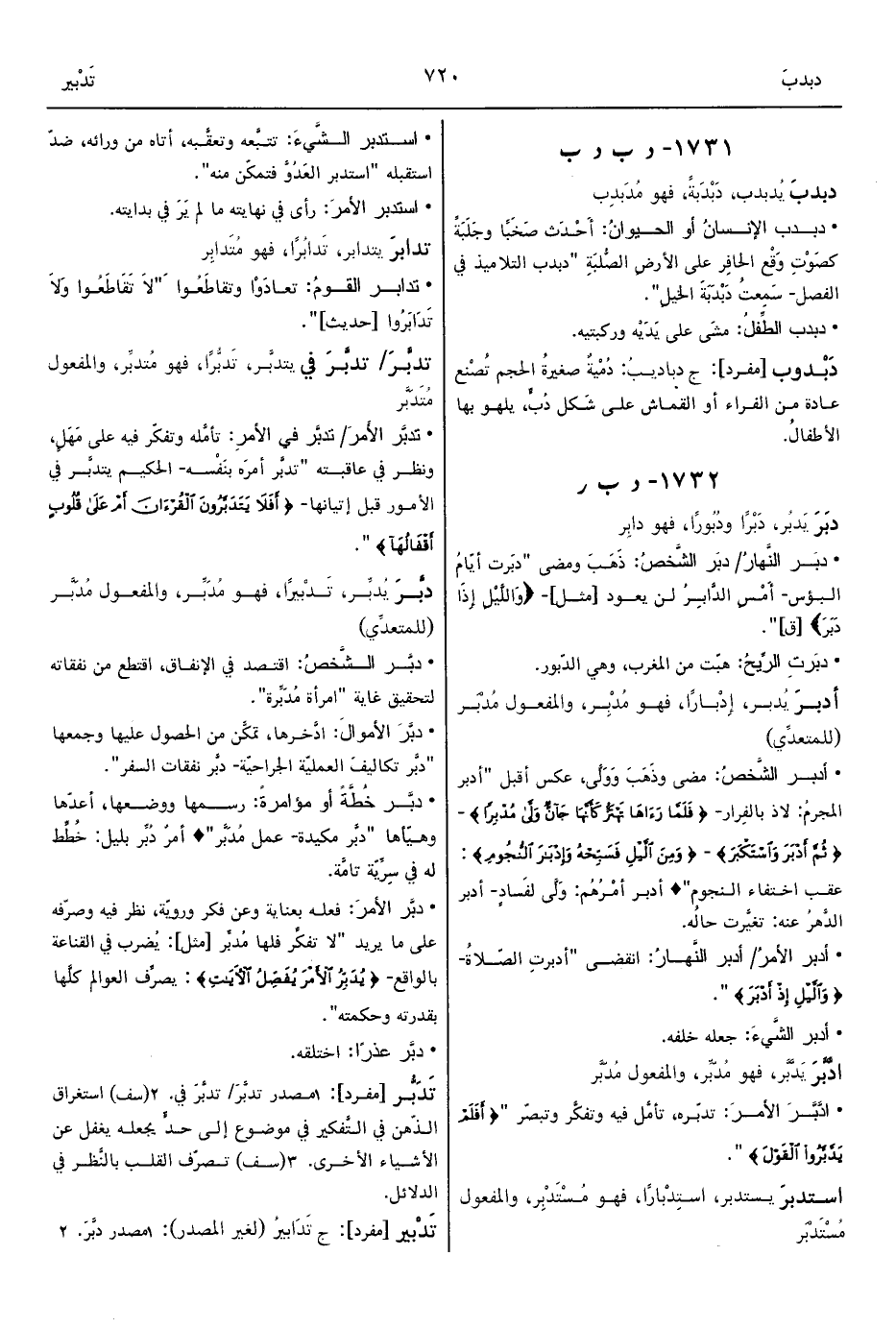 • ادَّبَّرَ الأمرَ: تدبّره، تأمَّل فيه وتفكَّر وتبصّر " {أَفَلَمْ يَدَّبَّرُوا الْقَوْلَ} ".
