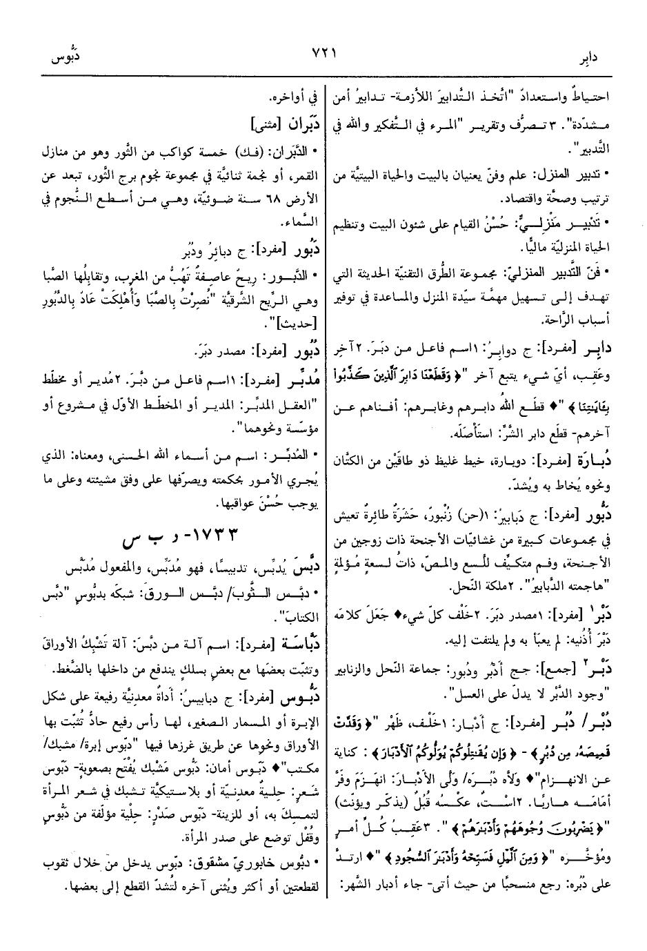 1 - خَلْف، ظَهْر " {وَقَدَّتْ قَمِيصَهُ مِنْ دُبُرٍ} - {وَإِنْ يُقَاتِلُوكُمْ يُوَلُّوكُمُ الأَدْبَارَ}: كناية عن الانهزام" ° وَلاَّه دُبُرَه/ وَلَّى الأَدْبارَ: انهَزَمَ وفَرَّ أمَامَه هاربًا.
