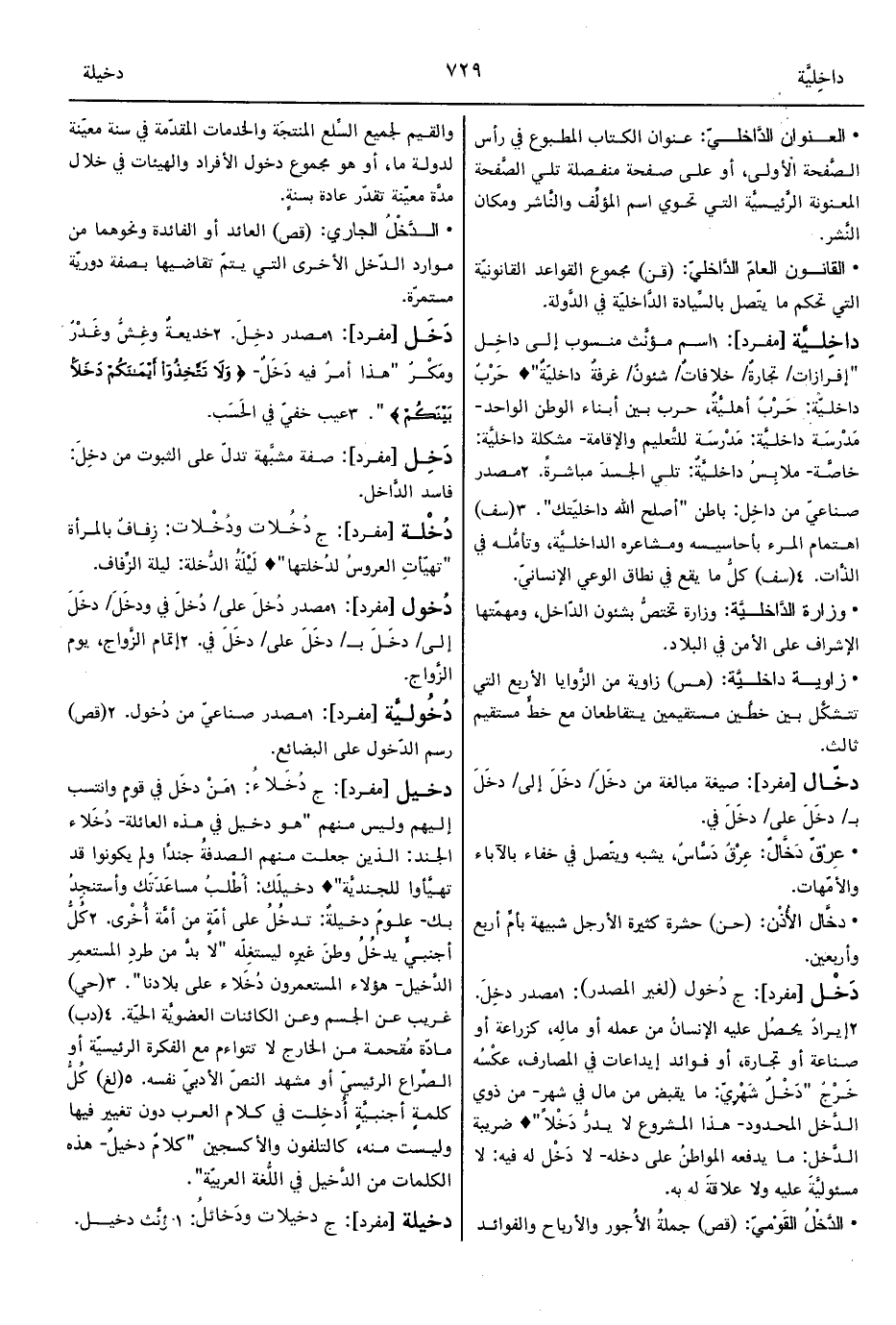 2 - إيرادٌ يحصُل عليه الإنسانُ من عمله أو مالِه، كزراعة أو صناعة أو تجارة، أو فوائد إيداعات في المصارف، عكْسُه خَرْجٌ "دَخْلٌ شَهْرِيّ: ما يقبض من مال في شهر- من ذوي الدَّخل المحدود- هذا المشروع لا يدرُّ دَخْلاً" ° ضريبة الدَّخل: ما يدفعه المواطنُ على دخله- لا دَخْل له فيه: لا مسئوليَّةَ عليه ولا علاقةَ له به.