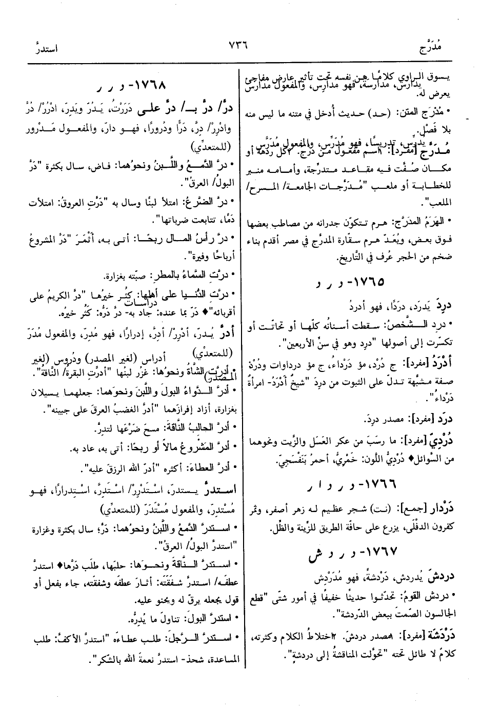 • درَّ الضَّرعُ: امتلأ لبنًا وسال به "دَرَّتِ العروقُ: امتلأت دَمًا، تتابعت ضرباتها".