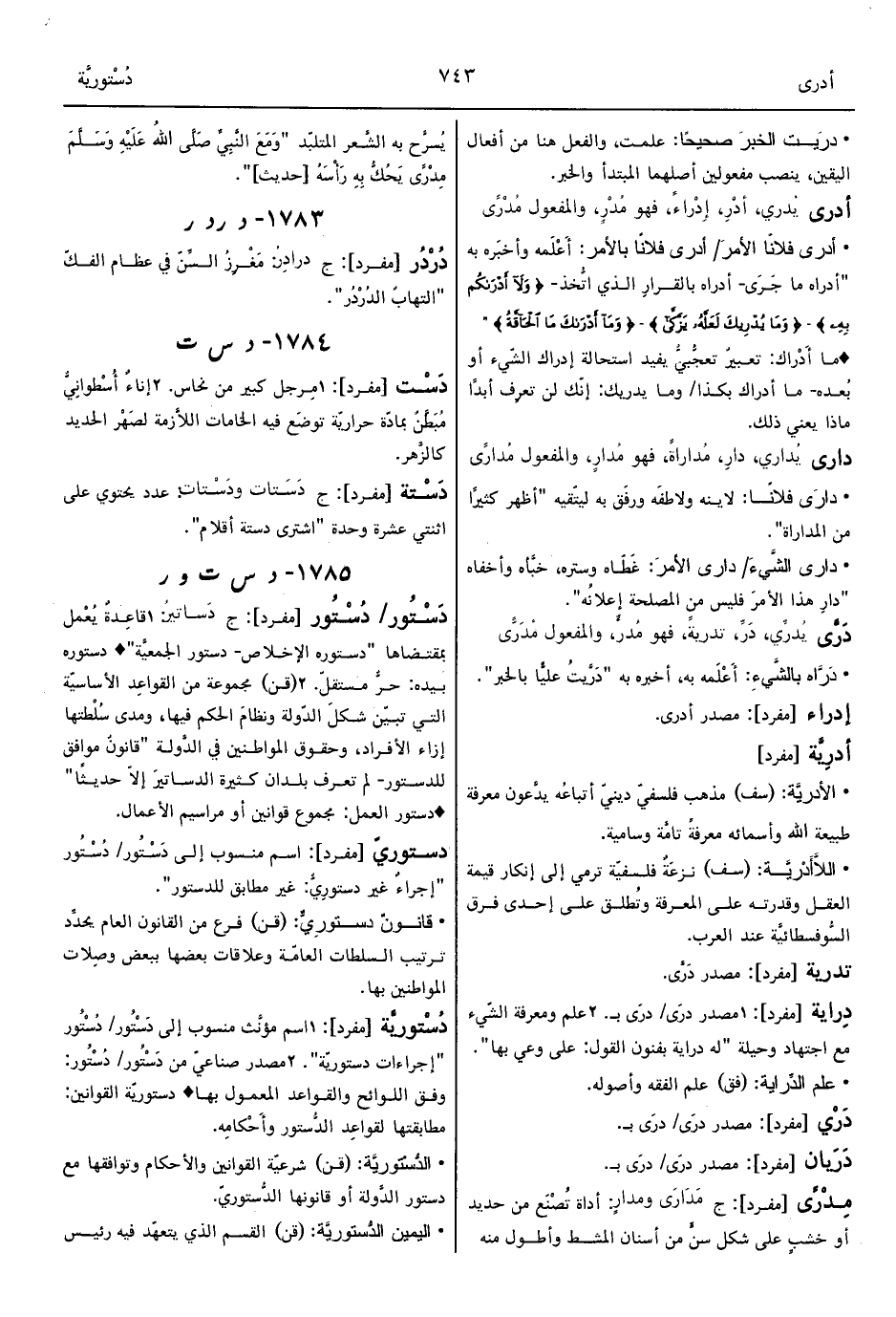 2 - (قن) مجموعة من القواعِد الأساسيّة التي تبيّن شكلَ الدّولة ونظامَ الحكم فيها، ومدى سُلْطتها إزاء الأفراد، وحقوق المواطنين في الدَّولة "قانونٌ موافق للدستور- لم تعرف بلدان كثيرة الدساتيرَ إلاّ حديثًا" ° دستور العمل: مجموع قوانين أو مراسيم الأعمال.