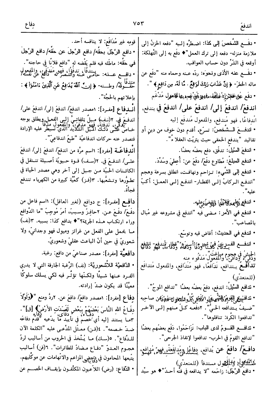 • دافع عنه: حامَى عنه وانتصر له "دافع عن نفسه/ حقوقه/ وطنه- {إِنَّ اللهَ يُدَافِعُ عَنِ الَّذِينَ ءَامَنُوا}: بإعلائهم بالحجَّة".