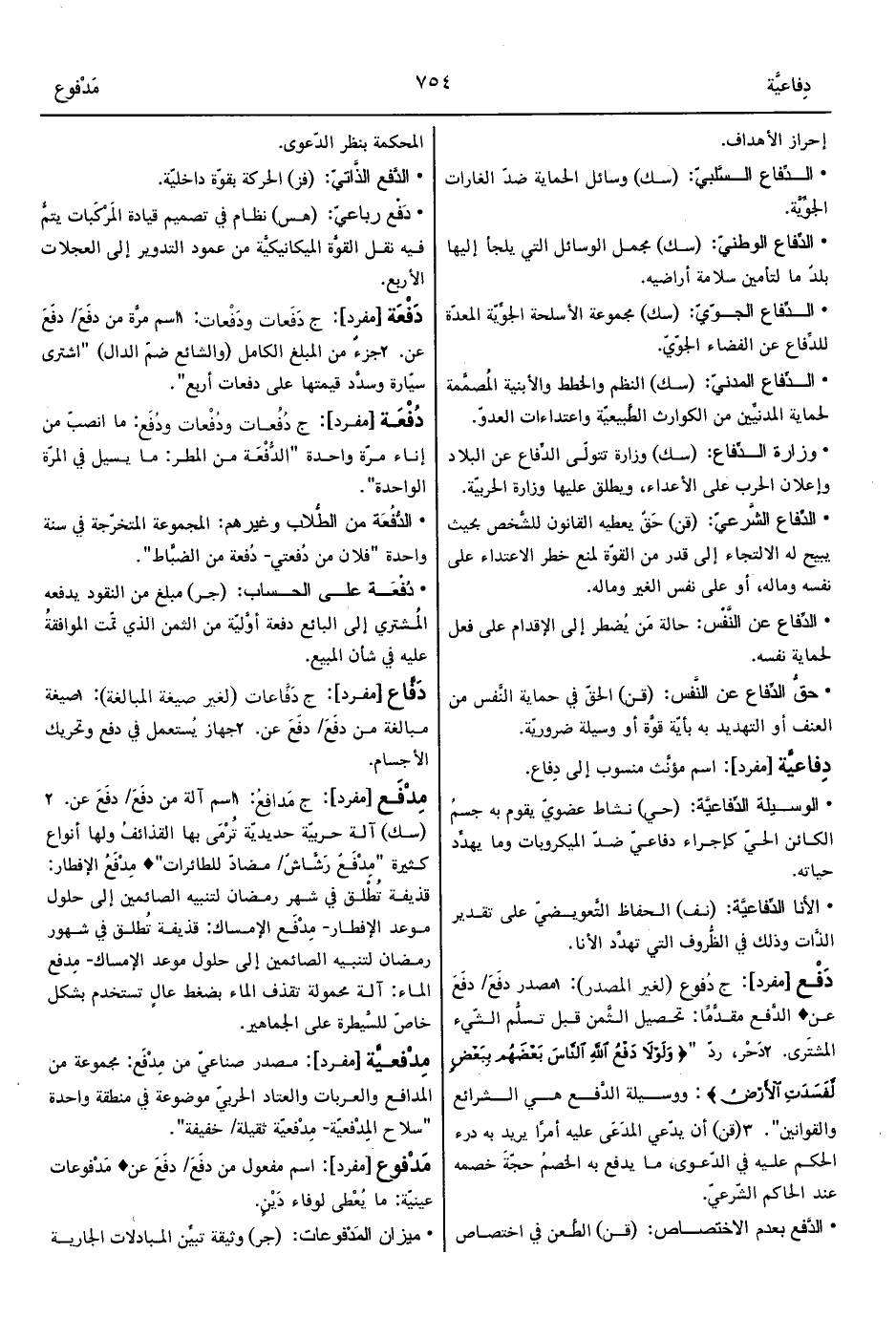 2 - دَحْر، ردّ " {وَلَوْلاَ دَفْعُ اللهِ النَّاسَ بَعْضَهُمْ بِبَعْضٍ لَفَسَدَتِ الأَرْضُ}: ووسيلة الدَّفع هي الشرائع والقوانين".