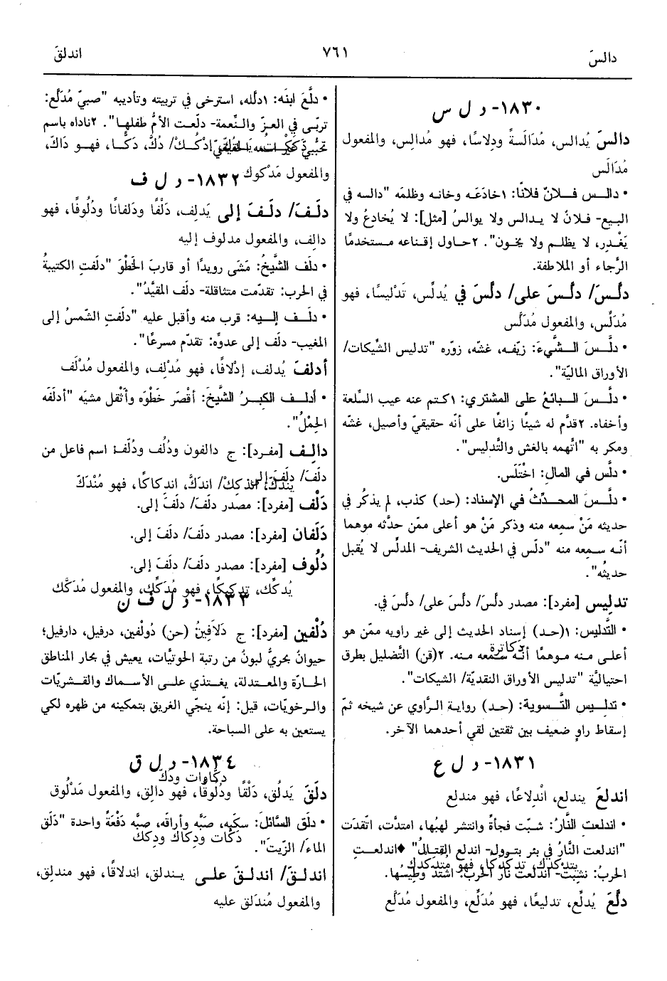 -[762]- • اندلقَ السَّائِلُ ونحوُه: مُطاوع دلَقَ: انصبَّ، انسكب "اندلق الماءُ: انصبّ دُفعَةً- اندلق الدَّمُ" ° اندلَقَتْ أحشاؤُه: خرجت مندفعةً من مكانِها.