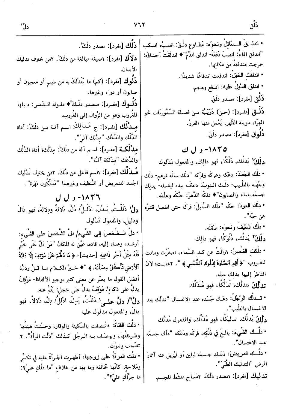 • دلَّت المرأةُ على زوجها: أظهرت الجرأةَ عليه في تكسُّرٍ ومَلاحةٍ، كأنّها تخالفه وما بها من خلافٍ "ما دلَّكِ عليّ؟: ما جرَّأكِ عليّ؟ ".