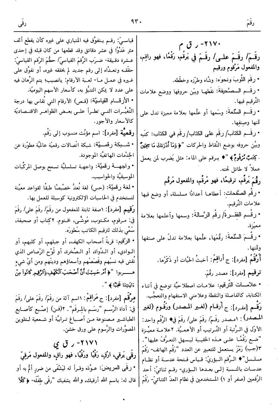 • رقَم الكتابَ/ رقَم على الكتاب/ رقَم في الكتاب: كتَبه وبيَّن حروفه بوضع النِّقاط والحركات " {وَمَا أَدْرَاكَ مَا سِجِّينٌ. كِتَابٌ مَرْقُومٌ} " ° يرقم على الماء: مثل يُضرب لمن يعمل عملاً لا طائل تحته.
