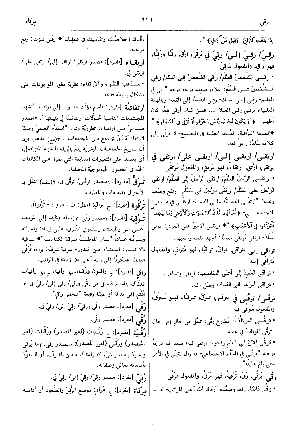 • رقِي الشَّخصُ السُّلَّمَ/ رقِي الشَّخصُ إلى السُّلَّم/ رقِي الشَّخصُ في السُّلَّم: علاه، صعِده درجة درجة "رقِي في العلم- رقِي إلى المُلْك- رقِي القمةَ/ إلى القمة- وبالهمة العلياء يرقى إلى العلا ... فمن كان أرقى هِمَّة كان أظهرا- {أَوْ يَكُونَ لَكَ بَيْتٌ مِنْ زُخْرُفٍ أَوْ تَرْقَى فِي السَّمَاءِ} " ° الطَّبقة الرَّاقية: الطَّبقة العليا في المجتمع- لا يرقَى إلى كلامه شَكٌّ: رجلٌ ثقة.