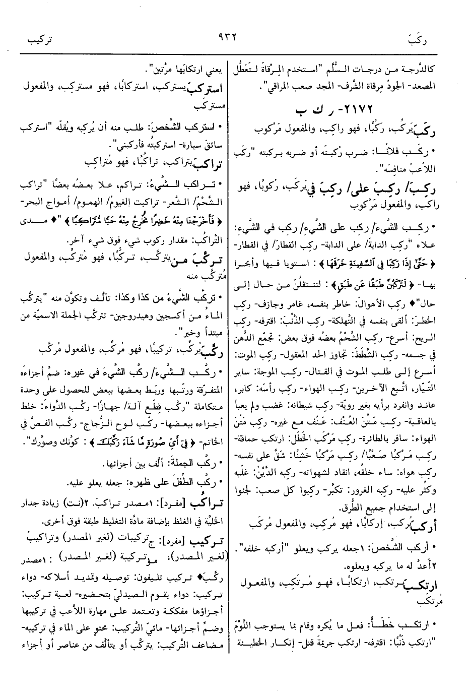 • ركِب الشَّيءَ/ ركِب على الشَّيءِ/ ركِب في الشَّيءِ: علاه "ركِب الدابةَ/ على الدابة- ركِب القطارَ/ في القطار- {حَتَّى إِذَا رَكِبَا فِي السَّفِينَةِ خَرَقَهَا}: استويا فيها وأبحرا بها- {لَتَرْكَبُنَّ طَبَقًا عَنْ طَبَقٍ}: لتنتقلُنّ من حال إلى حال" ° ركِب الأهوالَ: خاطر بنفسه، غامر وجازف- ركِب الخطرَ: ألقى بنفسه في التَّهلكة- ركِب الذَّنْبَ: اقترفه- ركِب الريح: أسرع- ركِب الشَّحْمُ بعضُه فوق بعض: تجمّع الدُّهن في جسمه- ركِب الشَّطَطَ: تجاوز الحد المعقول- ركِب الموت: أسرع إلى طلب الموت في القتال- ركِب الموجة: ساير التّيّار، اتَّبع الآخرين- ركِب الهواء- ركِب رأسَه: كابر، عاند وانفرد برأيه بغير رويّة- ركِب شيطانه: غضب ولم يعبأ بالعاقبة- ركِب مَتْنَ العُنْف: عَنُف مع غيره- ركِب مَتْنَ الهواء: سافر بالطائرة- ركِب مَرْكبًا صَعْبًا/ ركِب مَرْكبًا خَشِنًا: شَقَّ على نفسه- ركِب مَرْكَب الخَطَل: ارتكب حماقة- ركِبه الدَّيْنُ: غلَبه وكثُر عليه- ركِبه الغرور: تكبَّر- ركِب هواه: ساء خلقُه، انقاد لشهواته- ركِِبوا كل صعب: لجئوا إلى استخدام جميع الطُّرق.