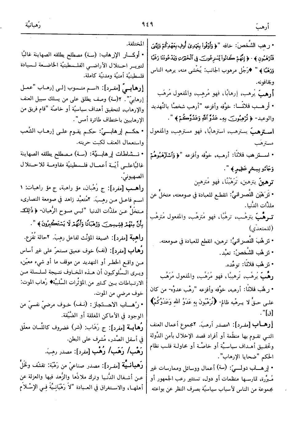 • أرهب فلانًا: خوَّفه وأفزعه "أرهب شخصًا بالتَّهديد والوعيد- {تُرْهِبُونَ بِهِ عَدُوَّ اللهِ وَعَدُوَّكُمْ} ".