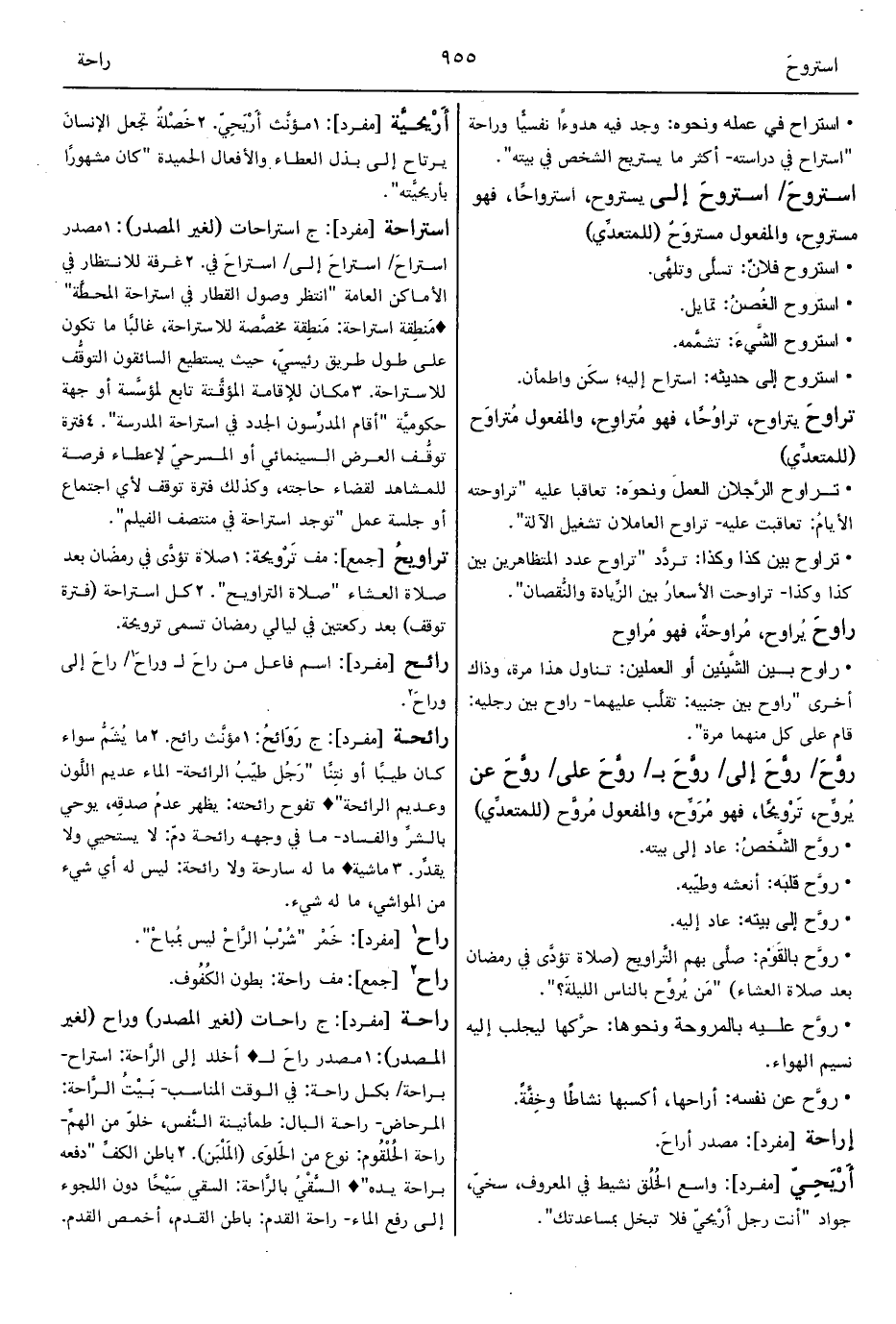1 - مصدر راحَ لـ ° أخلد إلى الرَّاحة: استراح- براحة/ بكل راحة: في الوقت المناسب- بَيْتُ الرَّاحة: المرحاض- راحة البال: طمأنينة النَّفس، خلوّ من الهمِّ- راحة الحُلْقُوم: نوع من الحَلوَى (المَلْبَن).