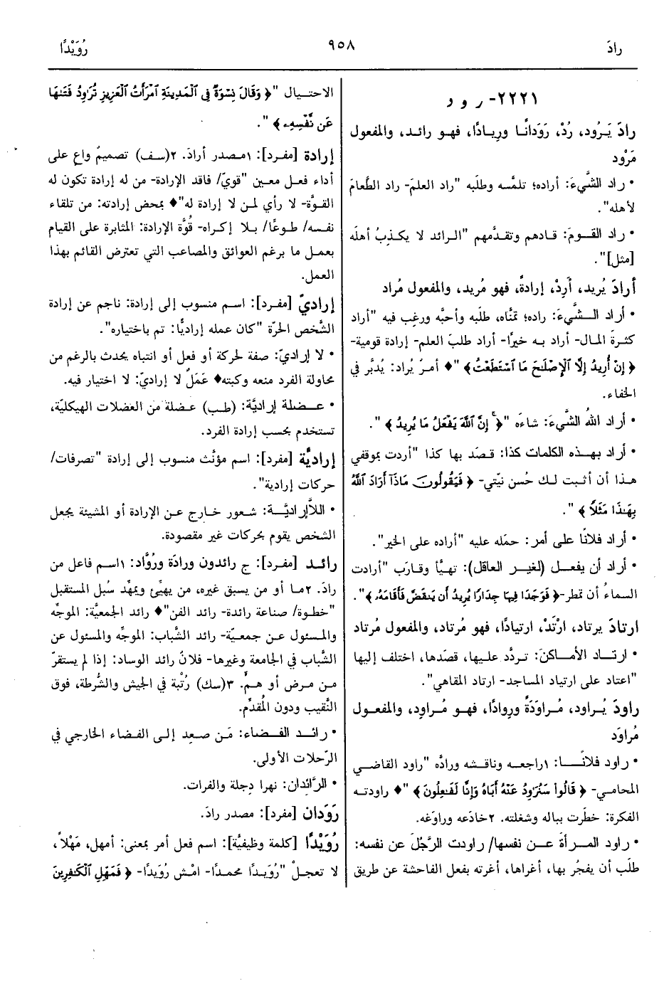 • أراد الشَّيءَ: راده؛ تمنَّاه، طلَبه وأحبَّه ورغِب فيه "أراد كثرةَ المال- أراد به خيرًا- أراد طلبَ العلم- إرادة قومية- {إِنْ أُرِيدُ إلاَّ الإِصْلاَحَ مَا اسْتَطَعْتُ} " ° أمرٌ يُراد: يُدبَّر في الخفاء.