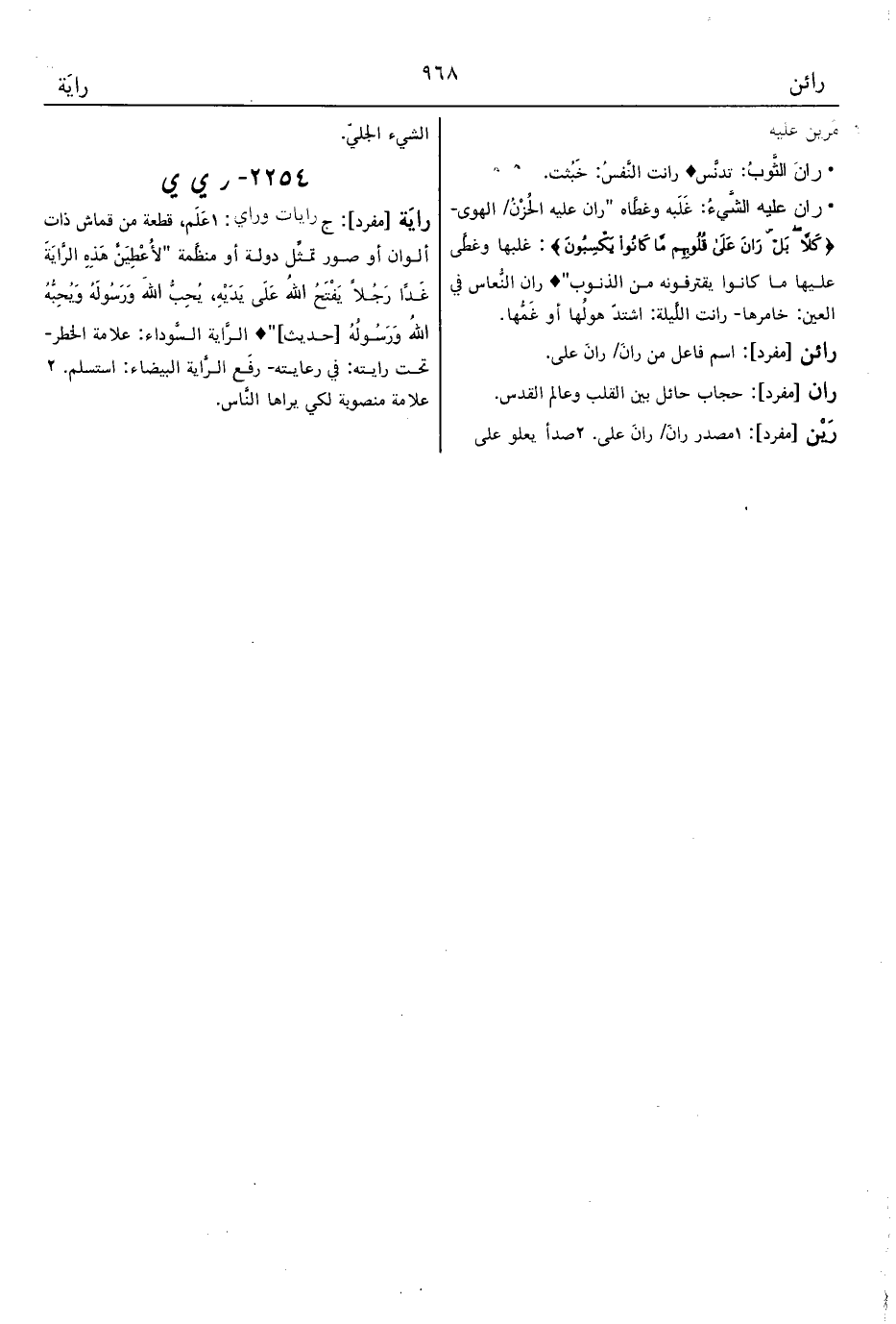 1 - عَلَم، قطعة من قماش ذات ألوان أو صور تمثِّل دولة أو منظَّمة "لأُعْطِيَنَّ هَذِهِ الرَّايَةَ غَدًا رَجُلاً يَفْتَحُ اللهُ عَلَى يَدَيْهِ، يُحِبُّ اللهَ وَرَسُولَهُ وَيُحِبُّهُ اللهُ وَرَسُولُهُ [حديث] " ° الرَّاية السَّوداء: علامة الخطر- تحت رايته: في رعايته- رفَع الرَّاية البيضاء: استسلم.