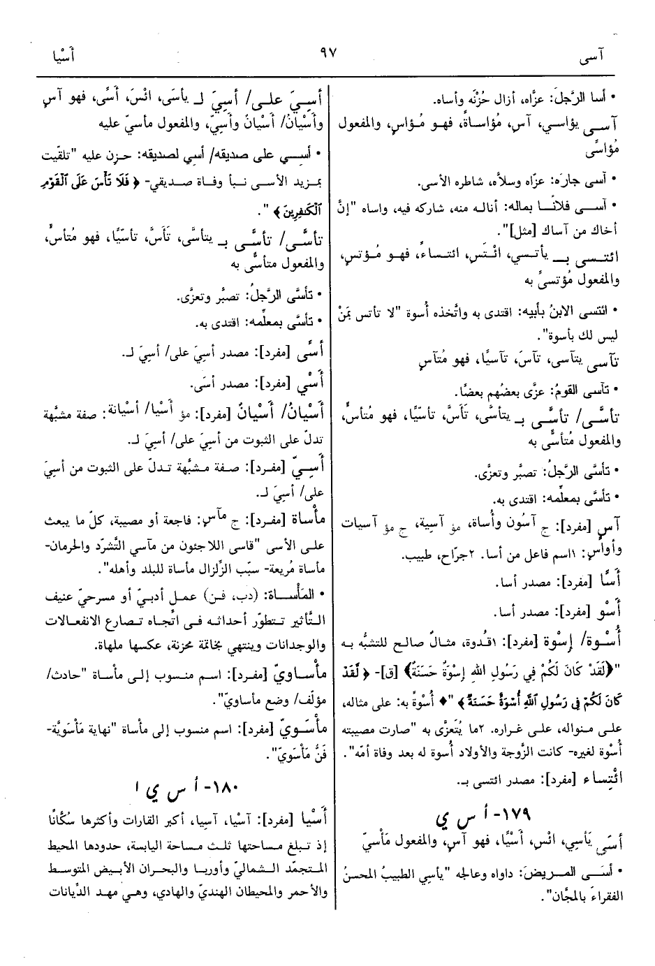 • آسى فلانًا بماله: أناله منه، شاركه فيه، واساه "إنَّ أخاك من آساك [مثل] ".