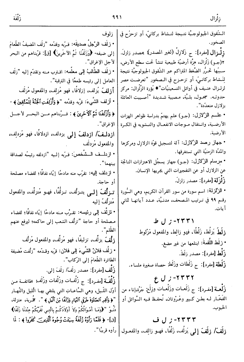 • أزلف الشَّيءَ: قرَّبه وقدَّمه " {وَأُزْلِفَتِ الْجَنَّةُ لِلْمُتَّقِينَ} - {وَأَزْلَفْنَا ثَمَّ الآخَرِينَ}: قرَّبناهم من البحر لأجل الإغراق".
