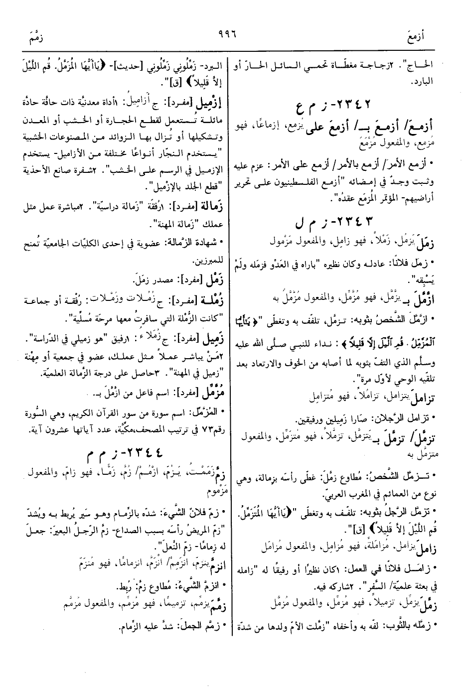 • ازَّمَّلَ الشَّخصُ بثوبه: تزمَّل، تلفّف به وتغطّى " {يَاأَيُّهَا الْمُزَّمِّلُ. قُمِ اللَّيْلَ إلاَّ قَلِيلاً}: نداء للنبي صلَّى الله عليه وسلَّم الذي التفّ بثوبه لما أصابه من الخوف والارتعاد بعد تلقّيه الوحي لأوّل مرة".