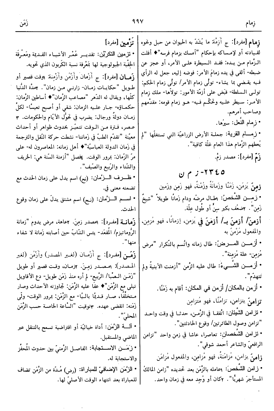 3 - عصر، فترة من الوقت تتميّز بحدوث ظواهر أو أحداث معيّنة "تقدّم الطبّ في زَماننا- نشطت حركة النّقل والترجمة في زَمان الدولة العباسيّة" ° أهل زمانه: المعاصرون له- على مرّ الزّمان: بمرور الوقت.