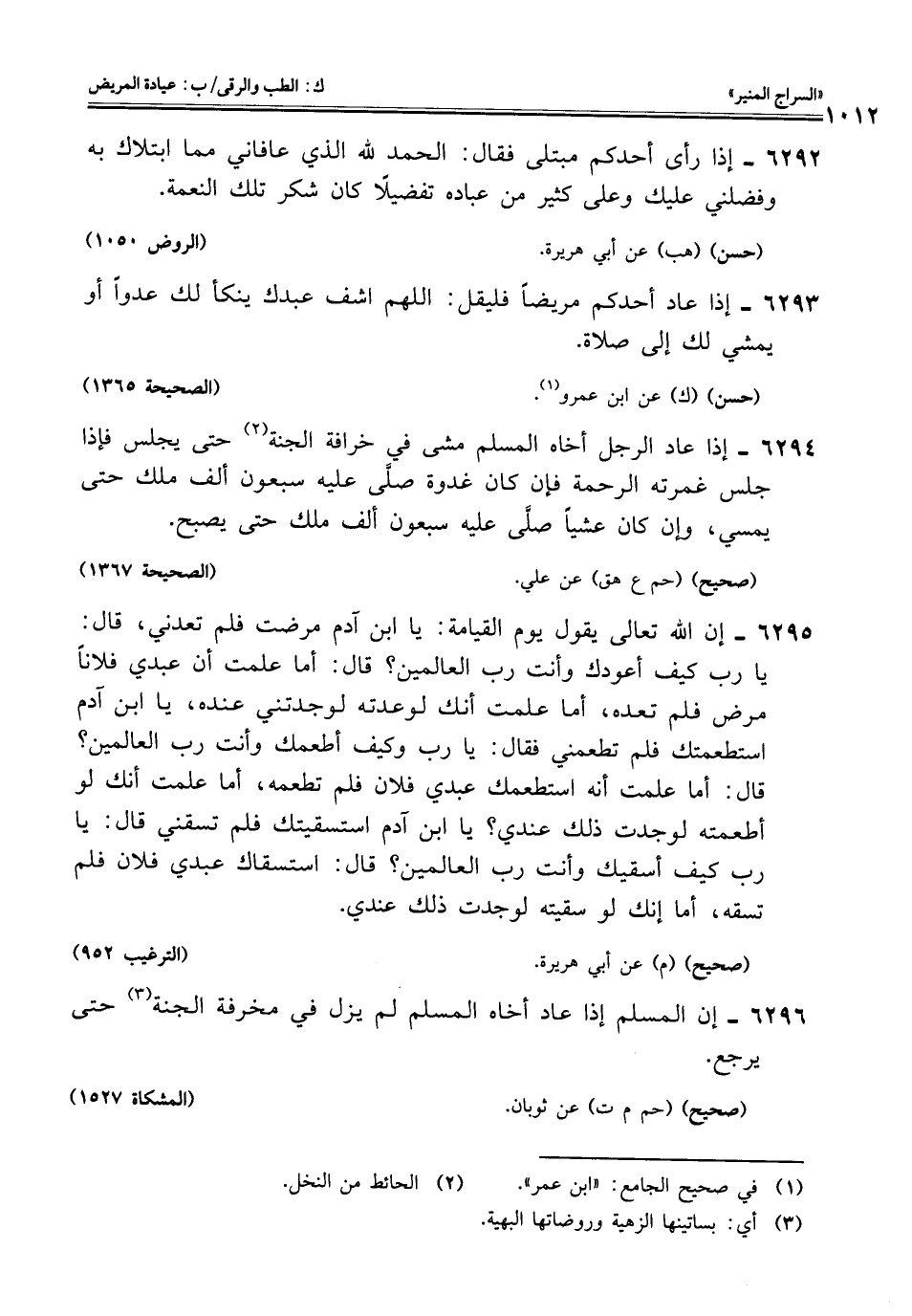 6294 - إذا عاد الرجل أخاه المسلم مشى في خرافة الجنة (¬2) حتى يجلس فإذا جلس غمرته الرحمة فإن كان غدوة صلَّى عليه سبعون ألف ملك حتى يمشي، وإن كان عشيًا صلَّى عليه سبعون ألف ملك حتى يصبح.