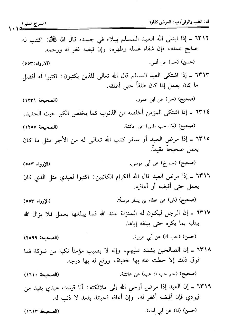 6316 - إذا مرض العبد قال اللَّه للكرام الكاتبين: اكتبوا لعبدي مثل الذي كان يعمل حتى أقبضه أو أعافيه.