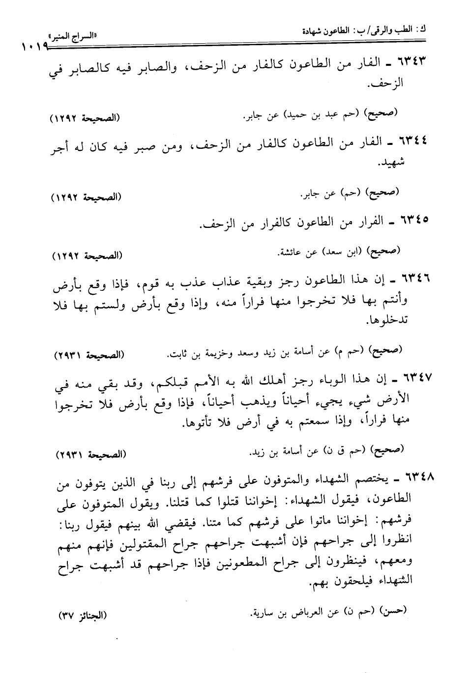 6343 - الفار من الطاعون كالفار من الزحف، والصابر فيه كالصابر في الزحف.