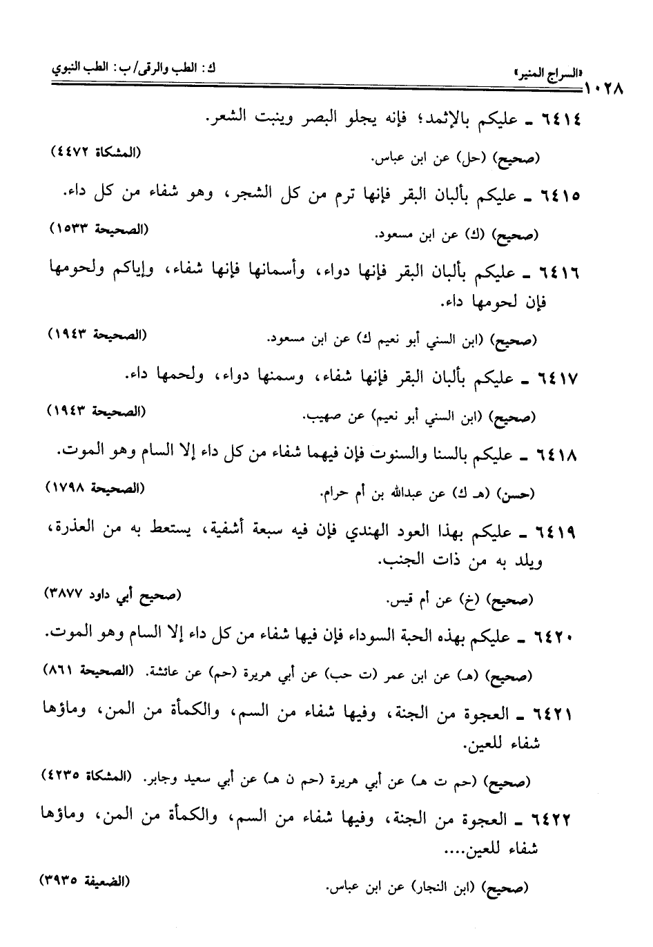 6416 - عليكم بألبان البقر فإنها دواء، وأسمانها فإنها شفاء، وإياكم ولحومها فإن لحومها داء.