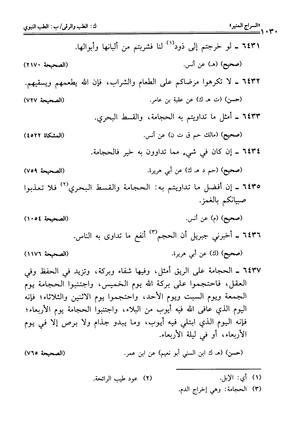 6436 - أخبرني جبريل أن الحجم (¬3) أنفع ما تداوى به الناس.