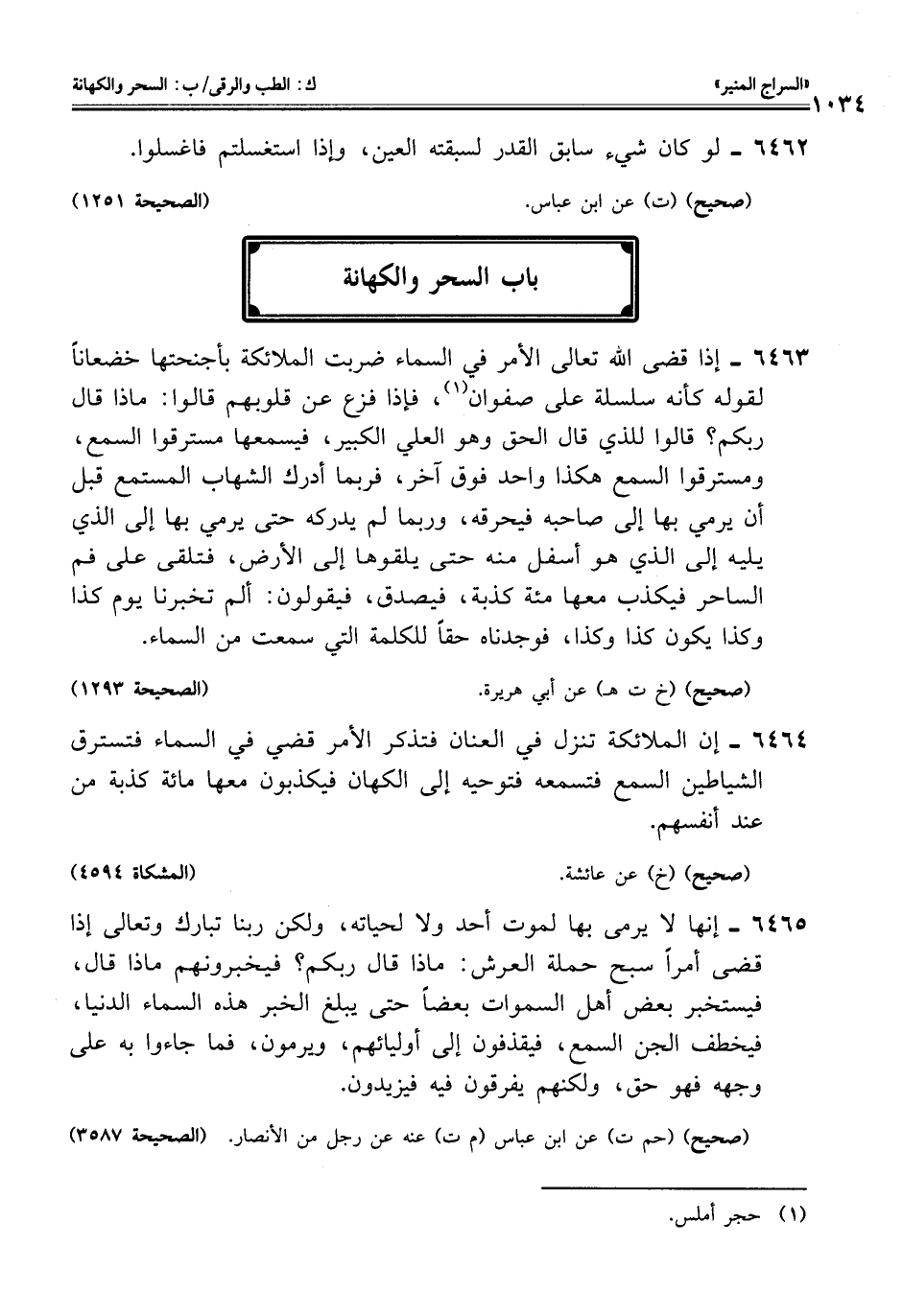 6463 - إذا قضى اللَّه تعالى الأمر في السماء ضربت الملائكة بأجنحتها خضعانًا لقوله كأنه سلسلة على صفوان (¬1)، فإذا فزع عن قلوبهم قالوا: ماذا قال ربكم؟ قالوا للذي قال الحق وهو العلي الكبير، فيسمعها مسترقوا السمع، ومسترقوا السمع هكذا واحد فوق آخر، فربما أدرك الشهاب المستمع قبل أن يرمي بها إلى صاحبه فيحرقه، وربما لم يدركه حتى يرمي بها إلى الذي يليه إلى الذي هو أسفل منه حتى يلقوها إلى الأرض، فتلقى على فم الساحر فيكذب معها مئة كذبة، فيصدق، فيقولون: ألم تخبرنا يوم كذا وكذا يكون كذا وكذا، فوجدناه حقًا للكلمة التي سمعت من السماء.