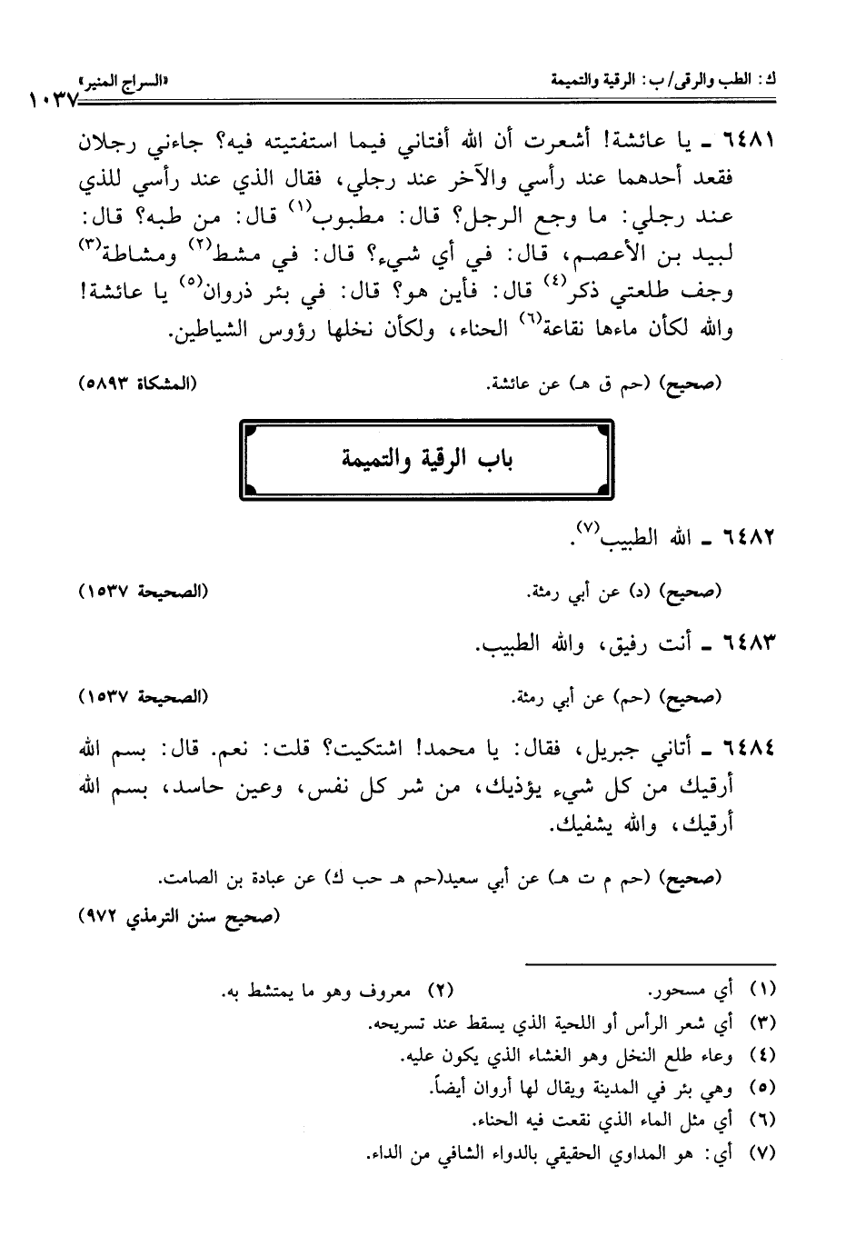6481 - يا عائشة! أشعرت أن اللَّه أفتاني فيما استفتيته فيه؟ جاءني رجلان فقعد أحدهما عند رأسي والآخر عند رجلي، فقال الذي عند رأسي للذي عند رجلي: ما وجع الرجل؟ قال: مطبوب (¬1) قال: من طبه؟ قال: لبيد بن الأعصم، قال: في أي شيء؟ قال: في مشط (¬2) ومشاطة (¬3) وجف طلعتي ذكر (¬4) قال: فأين هو؟ قال: في بئر ذروان (¬5) يا عائشة! واللَّه لكأن ماءها نقاعة (¬6) الحناء، ولكأن نخلها رؤوس الشياطين.