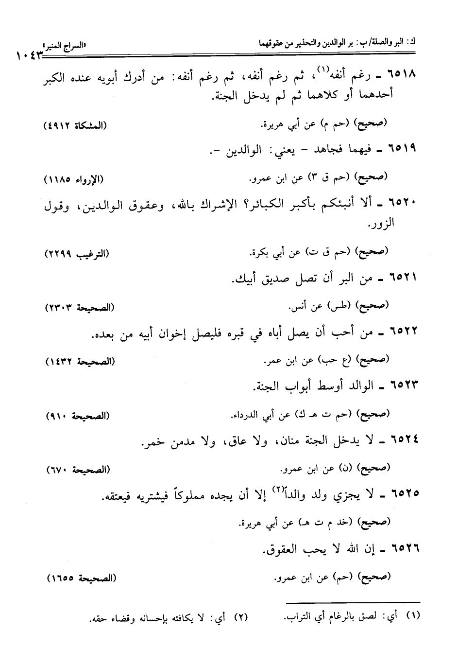 6518 - رغم أنفه (¬1)، ثم رغم أنفه، ثم رغم أنفه: من أدرك أبويه عنده الكبر أحدهما أو كلاهما ثم لم يدخل الجنة.
