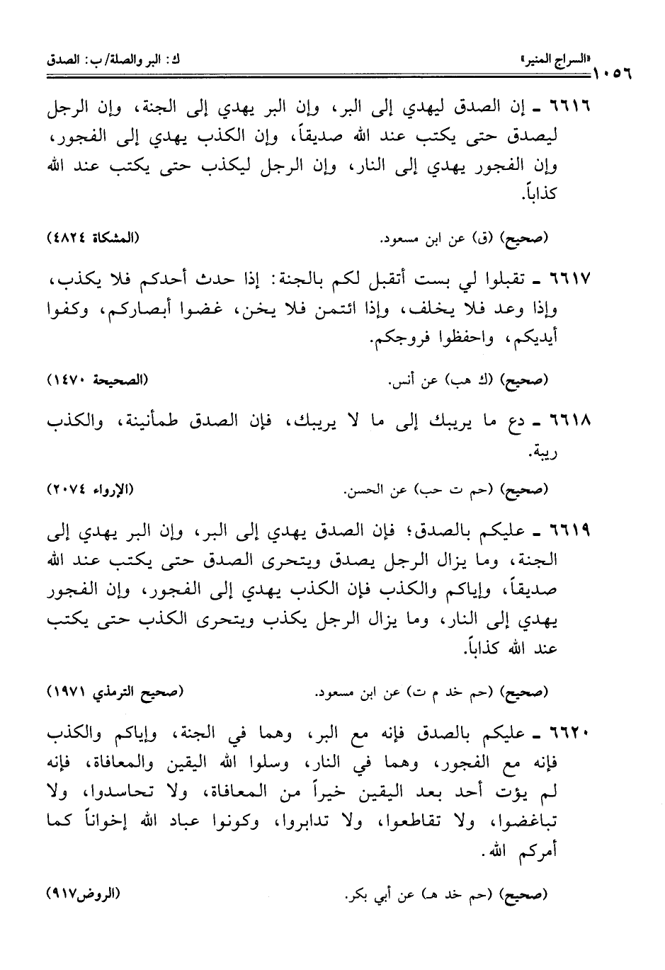 6616 - إن الصدق ليهدي إلى البر، وإن البر يهدي إلى الجنة، وإن الرجل ليصدق حتى يكتب عند اللَّه صديقًا، وإن الكذب يهدي إلى الفجور، وإن الفجور يهدي إلى النار، وإن الرجل ليكذب حتى يكتب عند اللَّه كذابًا.