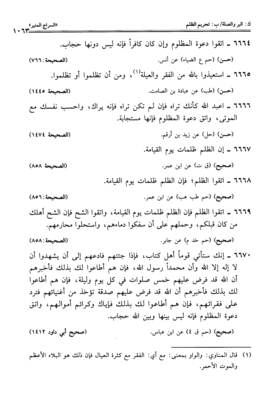 6669 - اتقوا الظلم فإن الظلم ظلمات يوم القيامة، واتقوا الشح فإن الشح أهلك من كان قبلكم، وحملهم على أن سفكوا دماءهم، واستحلوا محارمهم.