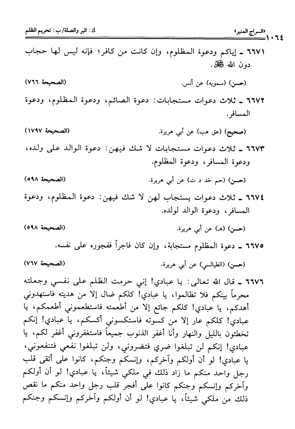 6676 - قال اللَّه تعالى: يا عبادي! إني حرمت الظلم على نفسي وجعلته محرمًا بينكم فلا تظالموا، يا عبادي! كلكم ضال إلا من هديته فاستهدوني أهدكم، يا عبادي! كلكم جائع إلا من أطعمته فاستطعموني أطعمكم، يا عبادي! كلكم عار إلا من كسوته فاستكسوني أكسكم، يا عبادي! إنكم تخطئون بالليل والنهار وأنا أغفر الذنوب جميعًا فاستغفروني أغفر لكم، يا عبادي! إنكم لن تبلغوا ضري فتضروني، ولن تبلغوا نفعي فتنفعوني، يا عبادي! لو أن أولكم وآخركم، وإنسكم وجنكم، كانوا على أتقى قلب رجل واحد منكم ما زاد ذلك في ملكي شيئًا، يا عبادي! لو أن أولكم وآخركم وإنسكم وجنكم كانوا على أفجر قلب رجل واحد منكم ما نقص ذلك من ملكي شيئًا، يا عبادي! لو أن أولكم وآخركم وإنسكم وجنكم