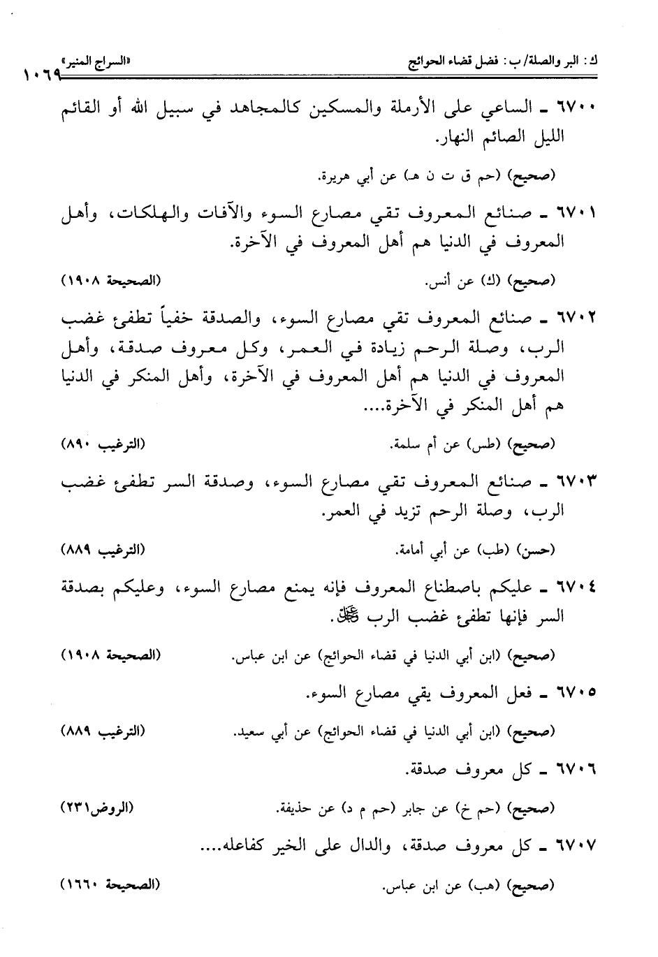 6704 - عليكم باصطناع المعروف فإنه يمنع مصارع السوء، وعليكم بصدقة السر فإنها تطفئ غضب الرب -عز وجل-.
