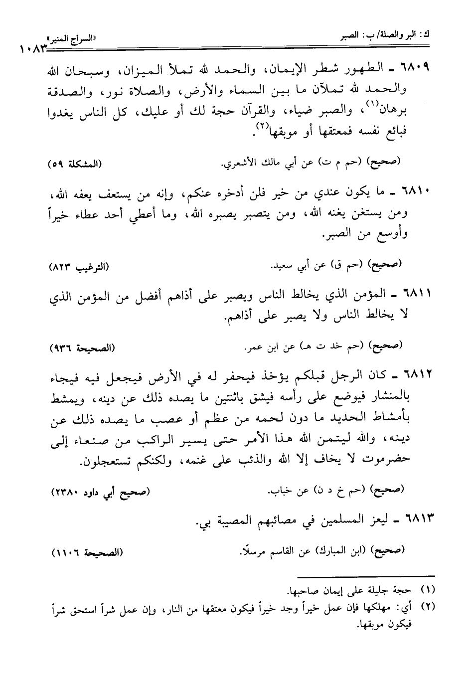 6809 - الطهور شطر الإيمان، والحمد للَّه تملأ الميزان، وسبحان اللَّه والحمد للَّه تملآن ما بين السماء والأرض، والصلاة نور، والصدقة برهان (¬1)، والصبر ضياء، والقرآن حجة لك أو عليك، كل الناس يغدوا فبائع نفسه فمعتقها أو موبقها (¬2).