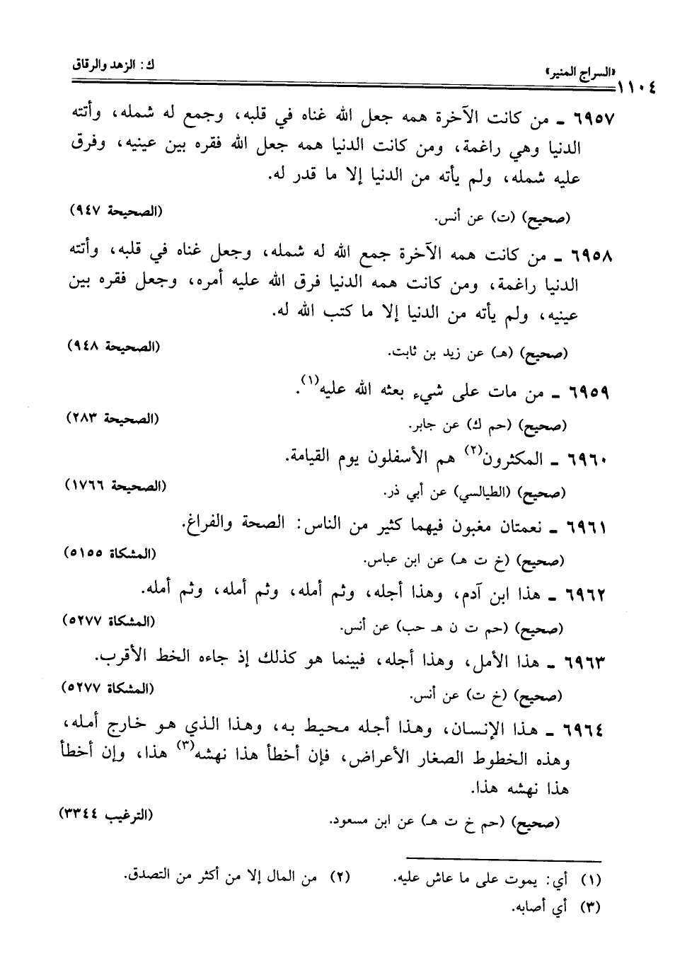 6957 - من كانت الآخرة همه جعل اللَّه غناه في قلبه، وجمع له شمله، وأتته الدنيا وهي راغمة، ومن كانت الدنيا همه جعل اللَّه فقره بين عينيه، وفرق عليه شمله، ولم يأته من الدنيا إلا ما قدر له.