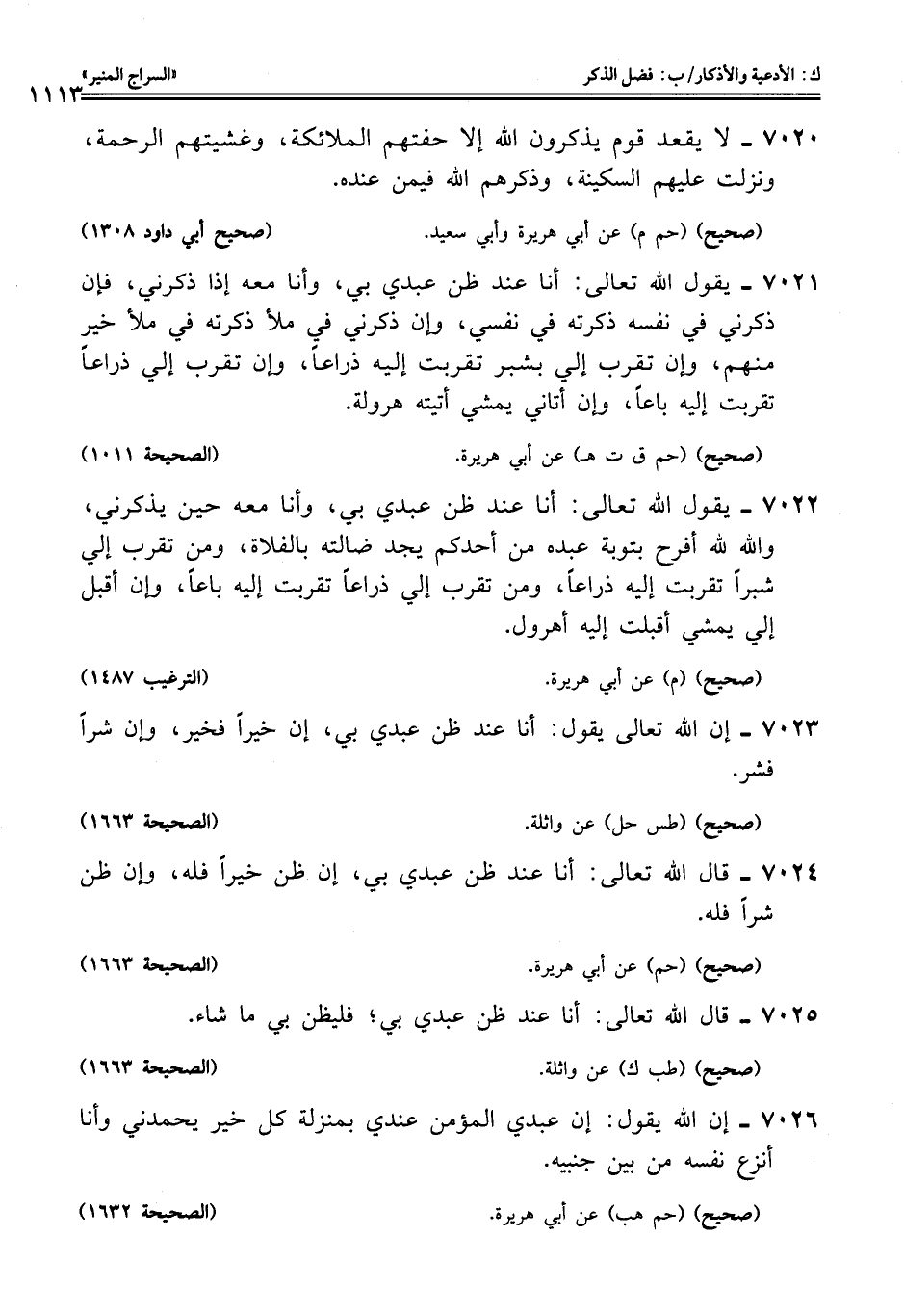 7021 - يقول اللَّه تعالى: أنا عند ظن عبدي بي، وأنا معه إذا ذكرني، فإن ذكرني في نفسه ذكرته في نفسي، وإن ذكرني في ملأ ذكرته في ملأ خير منهم، وإن تقرب إلي بشبر تقربت إليه ذراعًا، وإن تقرب إلي ذراعًا تقربت إليه باعًا، وإن أتاني يمشي أتيته هرولة.