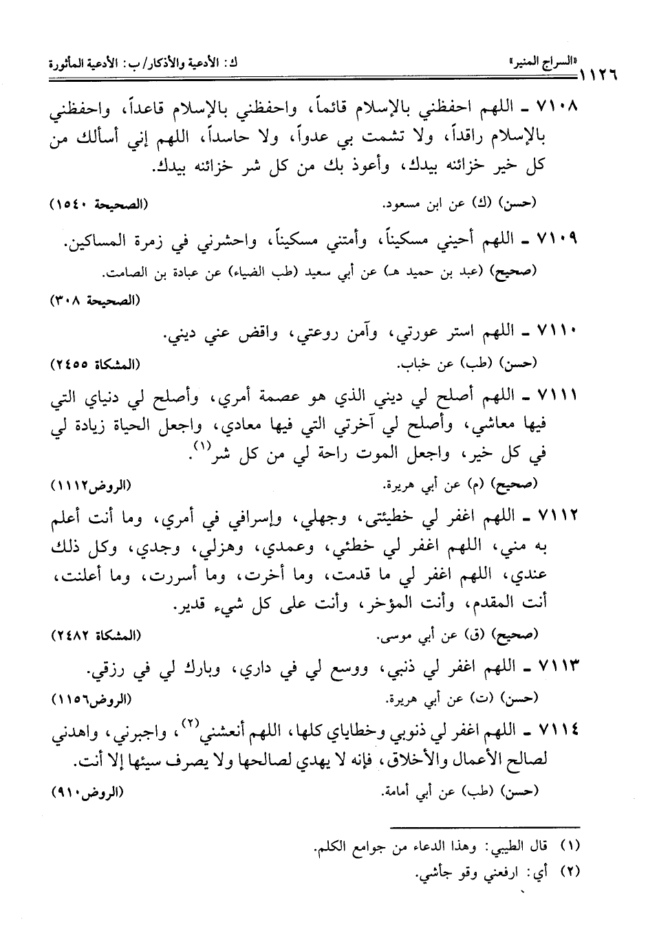 7111 - اللهم أصلح لي ديني الذي هو عصمة أمري، وأصلح لي دنياي التي فيها معاشي، وأصلح لي آخرتي التي فيها معادي، واجعل الحياة زيادة لي في كل خير، واجعل الموت راحة لي من كل شر (¬1).