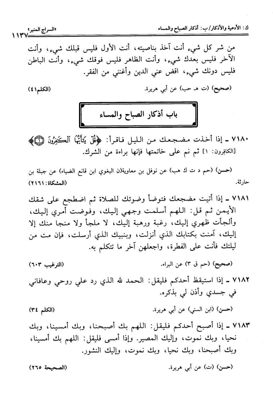 7180 - إذا أخذت مضجعك من الليل فاقرأ: {قُلْ يَاأَيُّهَا الْكَافِرُونَ} [الكافرون: 1] ثم نم على خاتمتها فإنها براءة من الشرك.