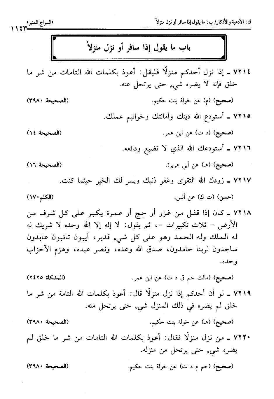 7220 - من نزل منزلًا فقال: أعوذ بكلمات اللَّه التامات من شر ما خلق لم يضره شيء حتى يرتحل من منزله.