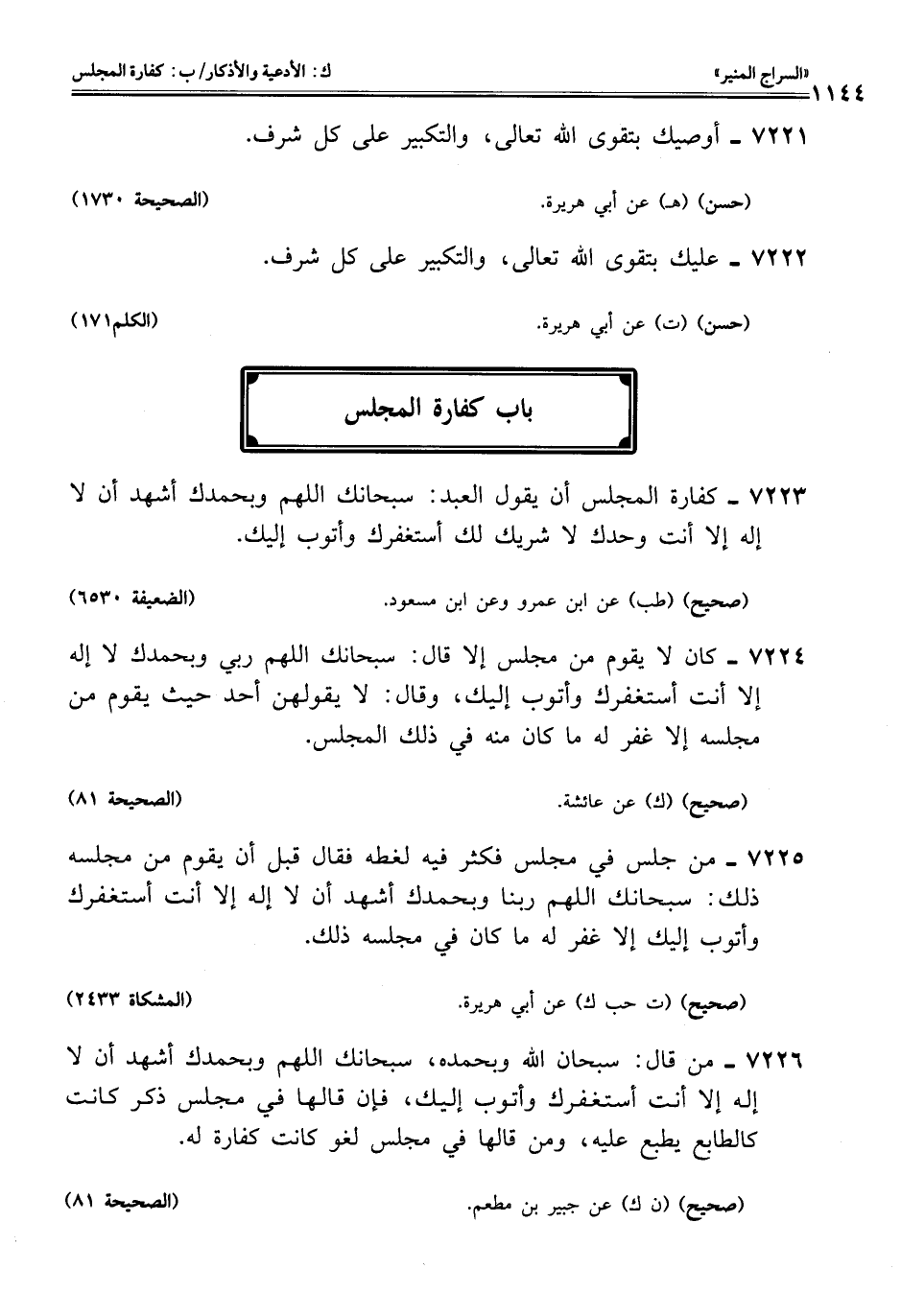 7223 - كفارة المجلس أن يقول العبد: سبحانك اللهم وبحمدك أشهد أن لا إله إلا أنت وحدك لا شريك لك أستغفرك وأتوب إليك.