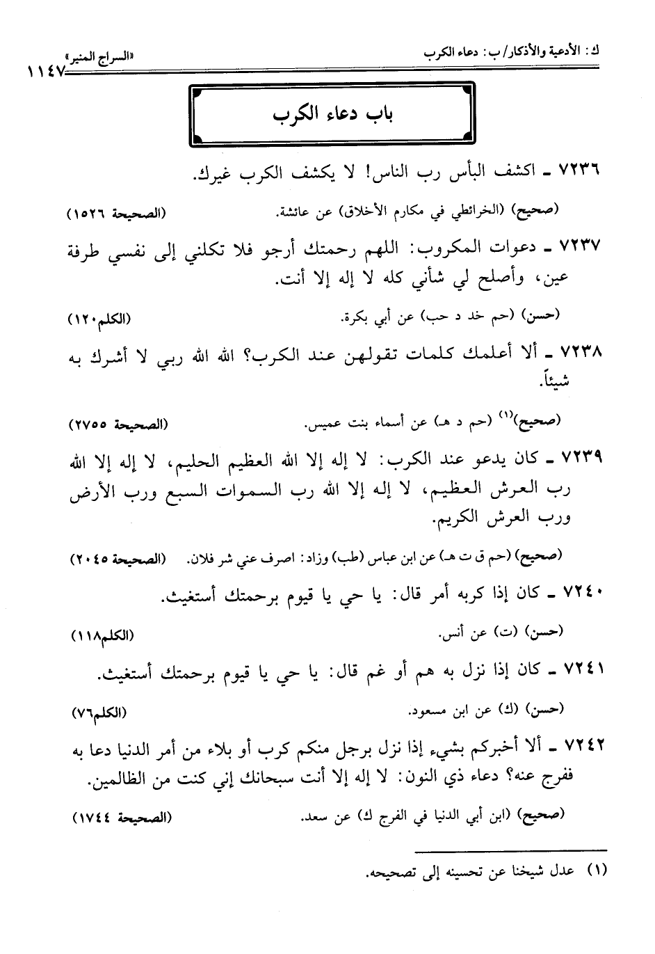 7239 - كان يدعو عند الكرب: لا إله إلا اللَّه العظيم الحليم، لا إله إلا اللَّه رب العرش العظيم، لا إله إلا اللَّه رب السموات السبع ورب الأرض ورب العرش الكريم.