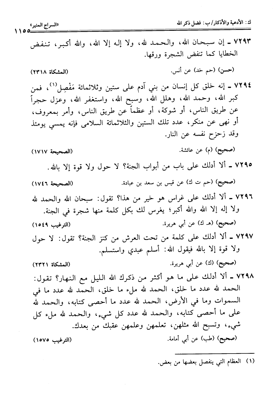 7298 - ألا أدلك على ما هو أكثر من ذكرك اللَّه الليل مع النهار؟ تقول: الحمد للَّه عدد ما خلق، الحمد للَّه ملء ما خلق، الحمد للَّه عدد ما في السموات وما في الأرض، الحمد للَّه عدد ما أحصى كتابه، والحمد للَّه على ما أحصى كتابه، والحمد للَّه عدد كل شيء، والحمد للَّه ملء كل شيء، وتسبح اللَّه مثلهن، تعلمهن وعلمهن عقبك من بعدك.
