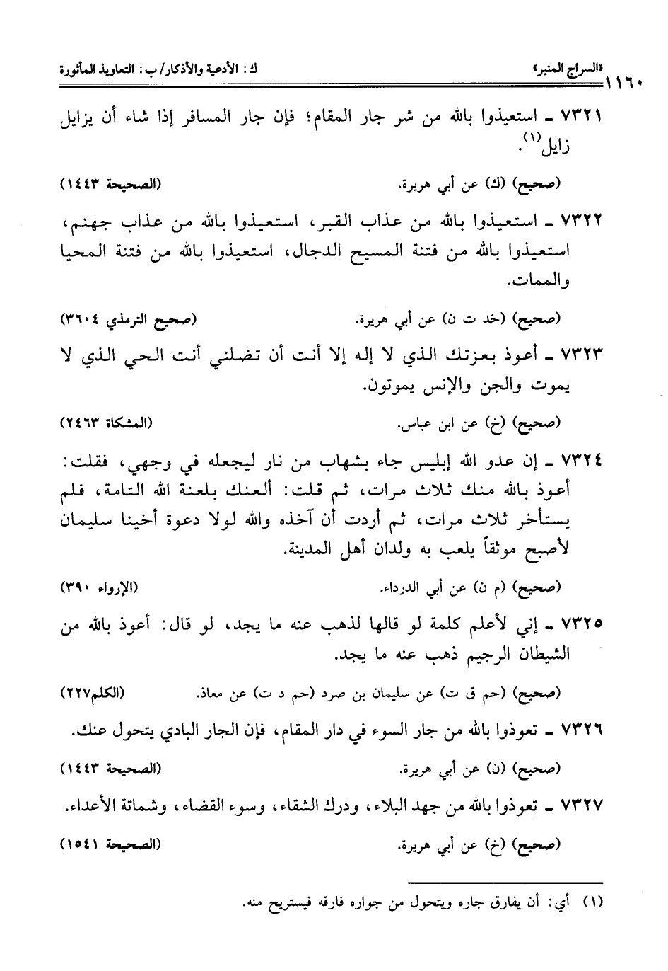 7321 - استعيذوا باللَّه من شر جار المقام؛ فإن جار المسافر إذا شاء أن يزايل زايل (¬1).