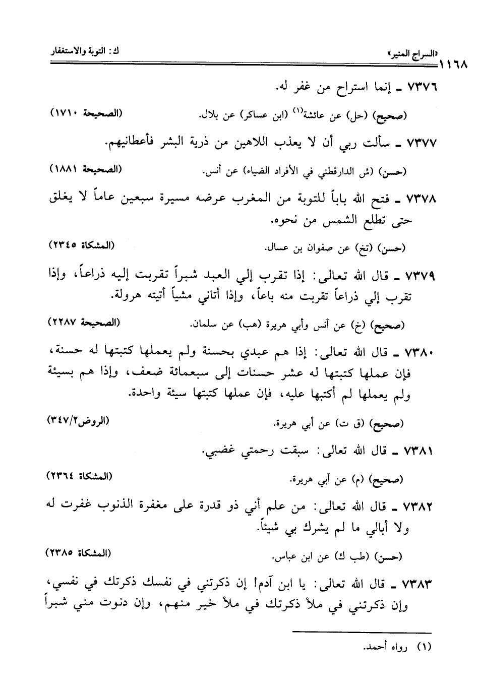 7379 - قال اللَّه تعالى: إذا تقرب إلي العبد شبرًا تقربت إليه ذراعًا، وإذا تقرب إلي ذراعًا تقربت منه باعًا، وإذا أتاني مشيًا أتيته هرولة.