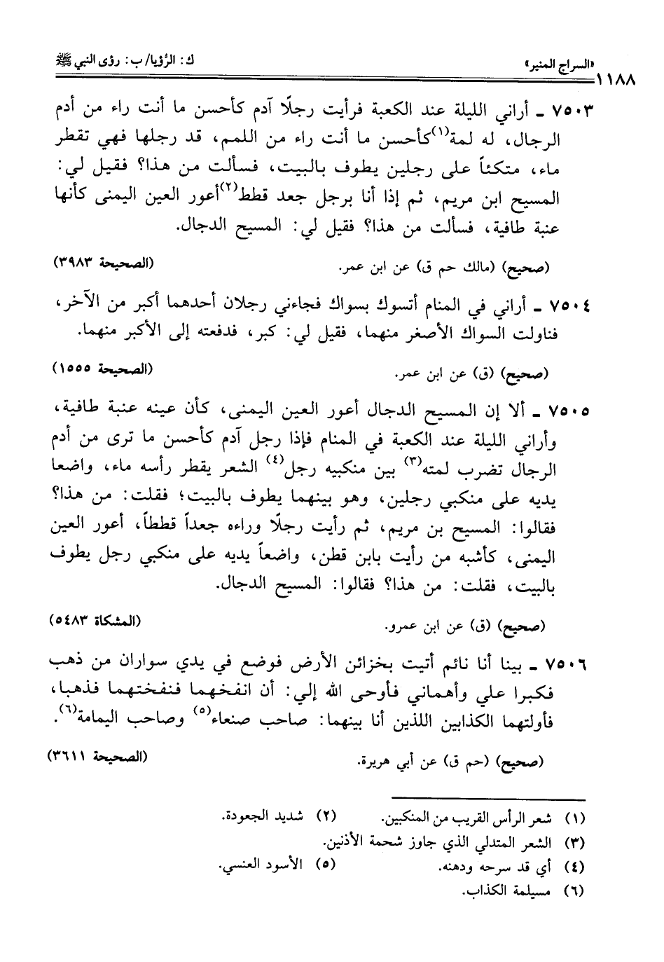 7505 - ألا إن المسيح الدجال أعور العين اليمنى، كأن عنبه عنبة طافية، وأراني الليلة عند الكعبة في المنام فإذا رجل آدم كأحسن ما ترى من أدم الرجال تضرب لمته (¬3) بين منكبيه رجل (¬4) الشعر يقطر رأسه ماء، واضعا يديه على منكبي رجلين، وهو بينهما يطوف بالبيت؛ فقلت: من هذا؟ فقالوا: المسيح بن مريم، ثم رأيت رجلًا وراءه جعدًا قططًا، أعور العين اليمنى، كأشبه من رأيت بابن قطن، واضعًا يديه على منكبي رجل يطوف بالبيت، فقلت: من هذا؟ فقالوا: المسيح الدجال.